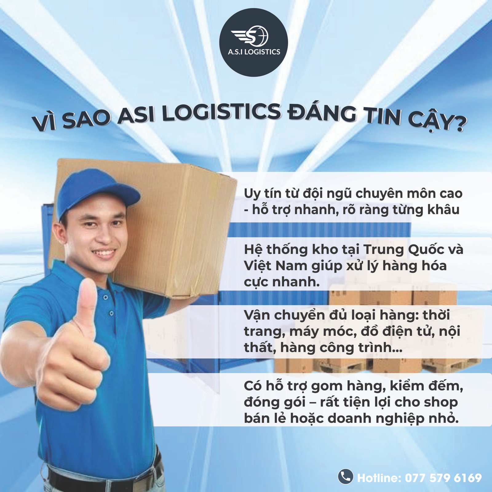 ASI Logistics là thương hiệu cung cấp giải pháp vận chuyển hàng hóa trọn gói từ Trung Quốc về Việt Nam. Với cam kết về Tin cậy, Nhanh chóng và Tiết kiệm, ASI Logistics định vị mình là cầu nối vững chắc, giúp các nhà bán hàng và doanh nghiệp Việt Nam tiếp cận nguồn hàng Trung Quốc một cách dễ dàng và hiệu quả.
