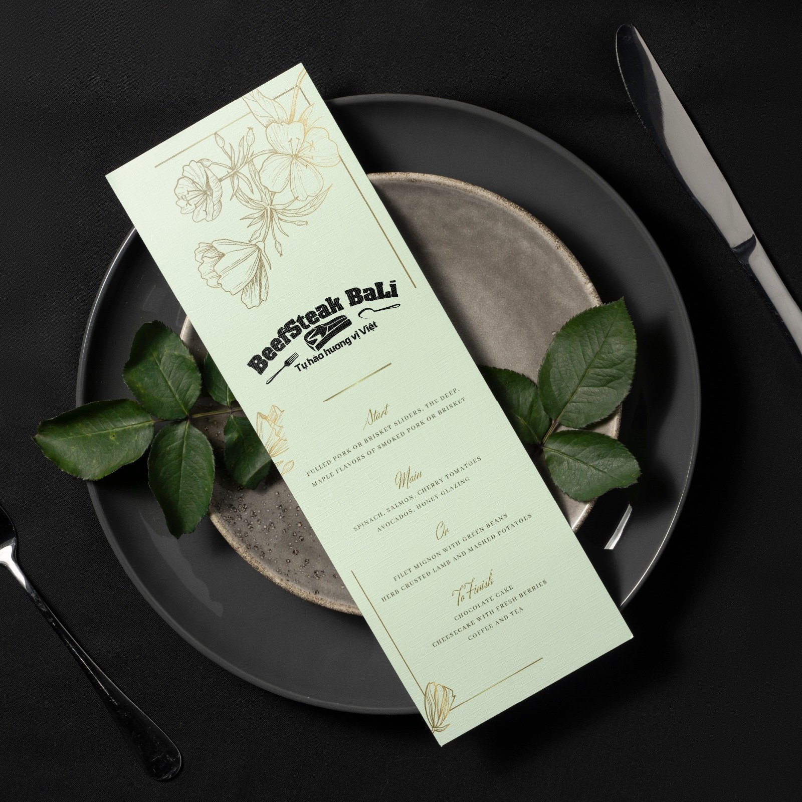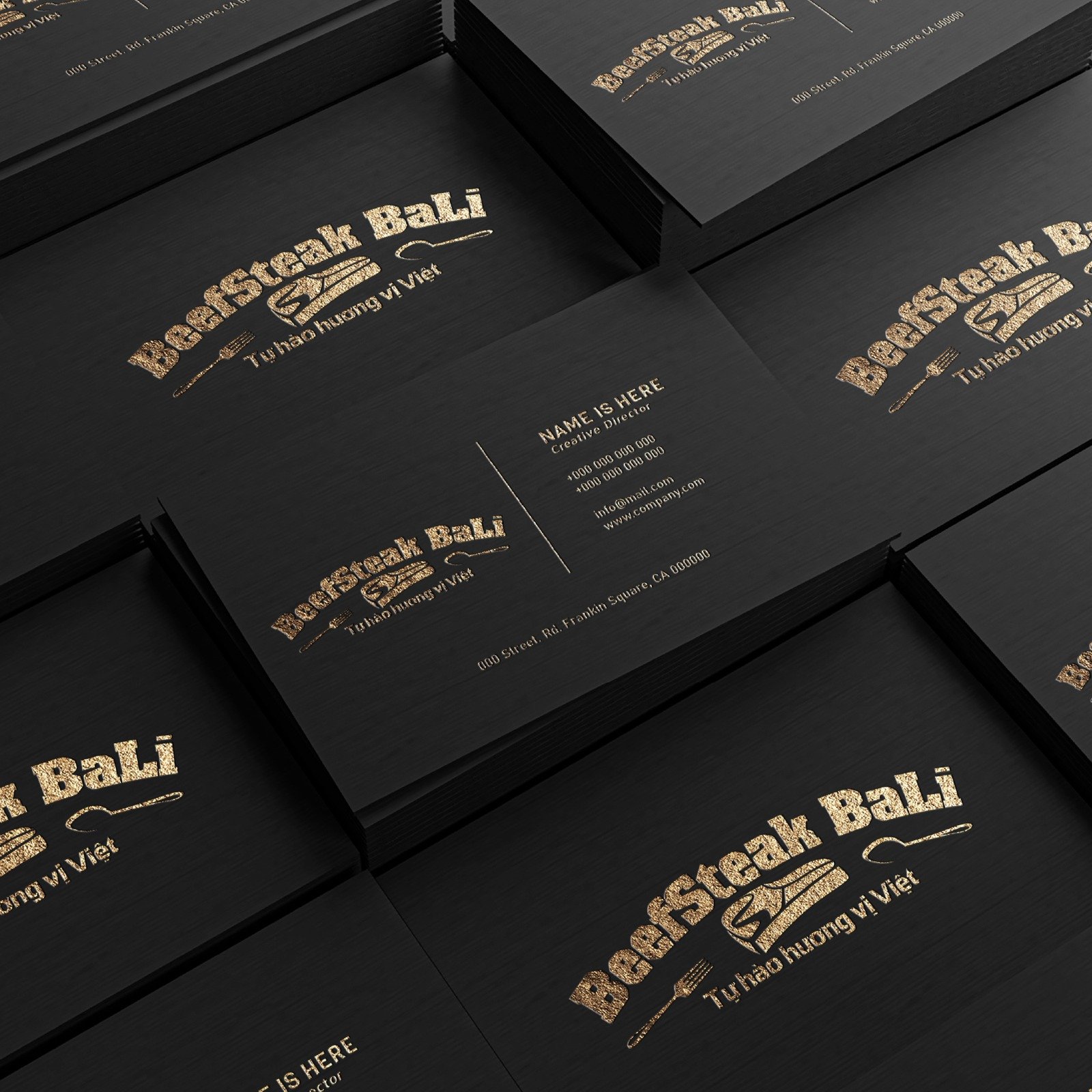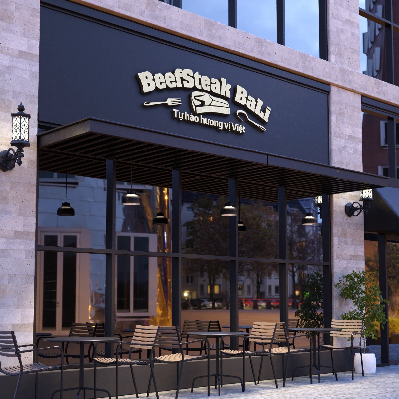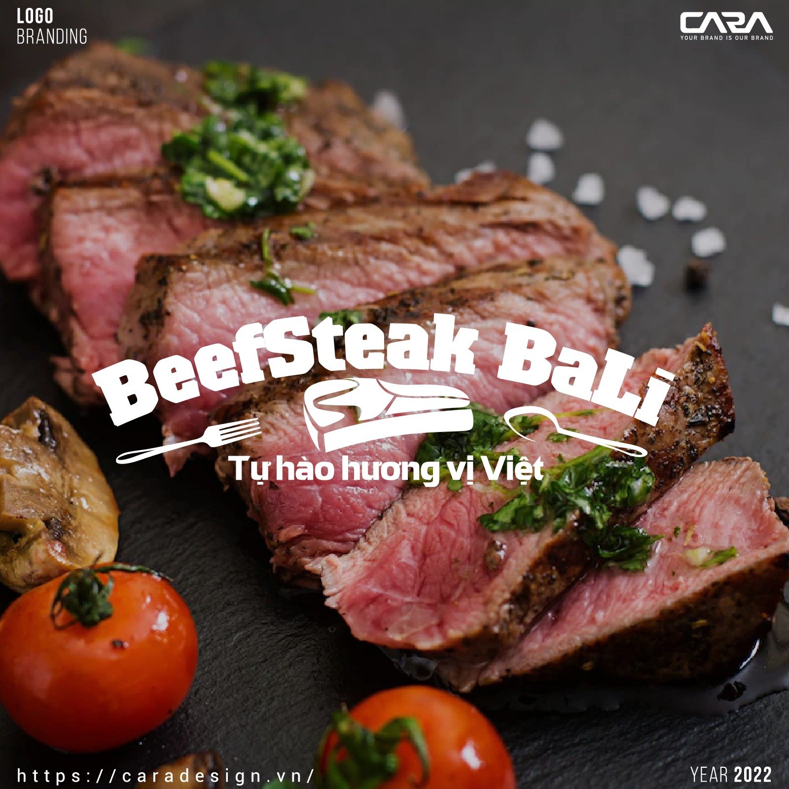 Logo Beefsteak Bali sử dụng hình ảnh miếng bít tết chủ đạo kết hợp cùng thìa dĩa hai bên để định vị rõ mô hình nhà hàng. Bố cục ngang được lựa chọn nhằm tối ưu hiển thị trên biển bảng và tăng tính ứng dụng thực tế.
