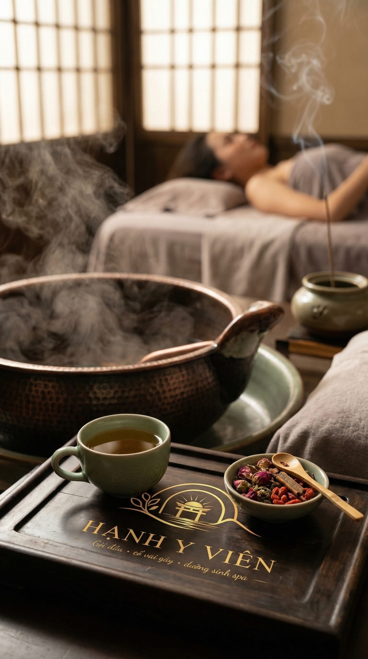 Thảo mộc (The Healing Leaf): Nhánh lá vươn lên mềm mại bên trái đại diện cho nguồn nguyên liệu thảo mộc tự nhiên, an toàn và lành tính mà spa sử dụng.
