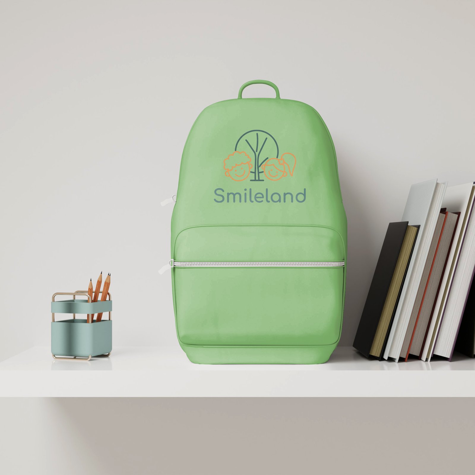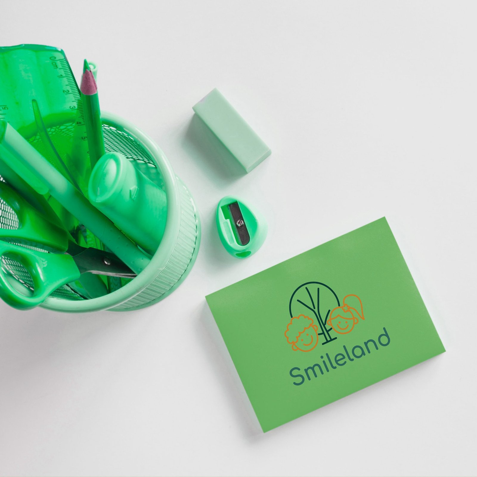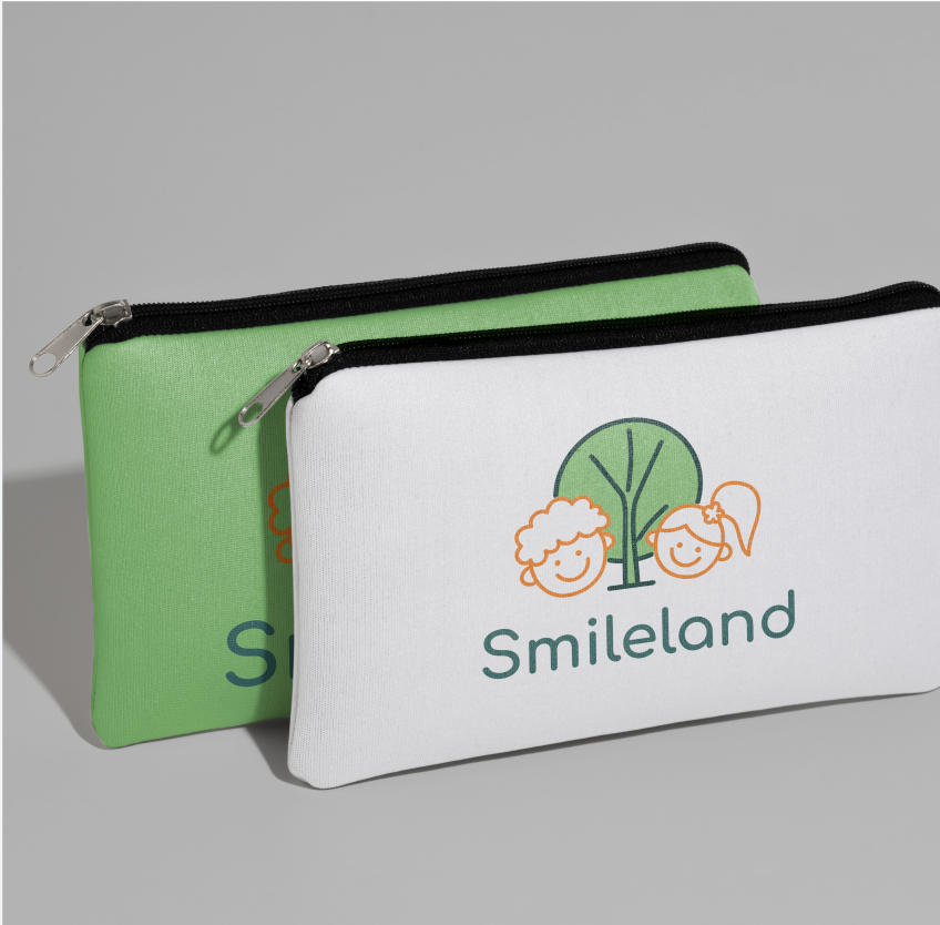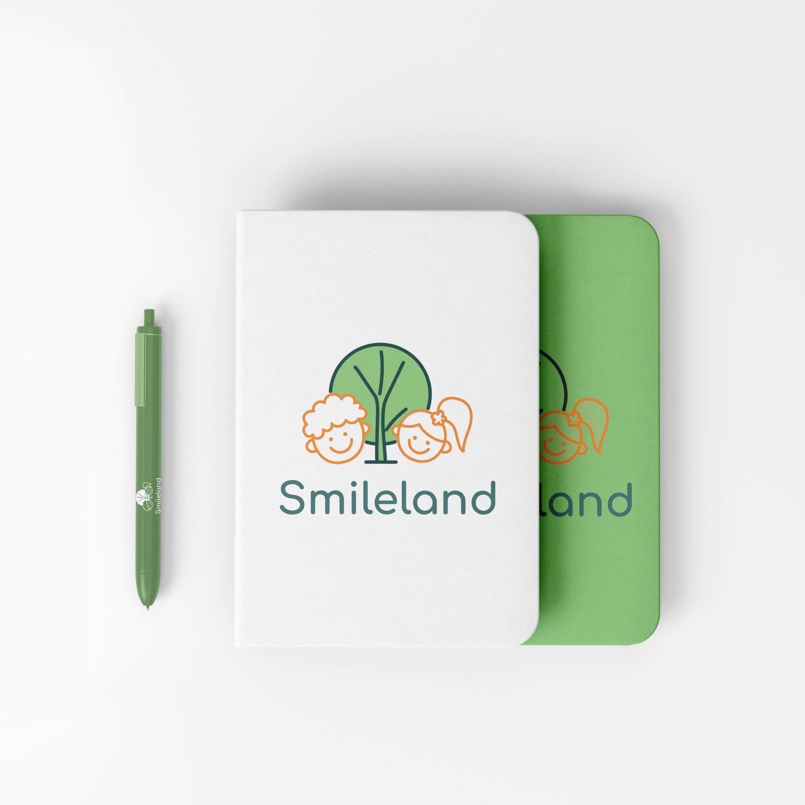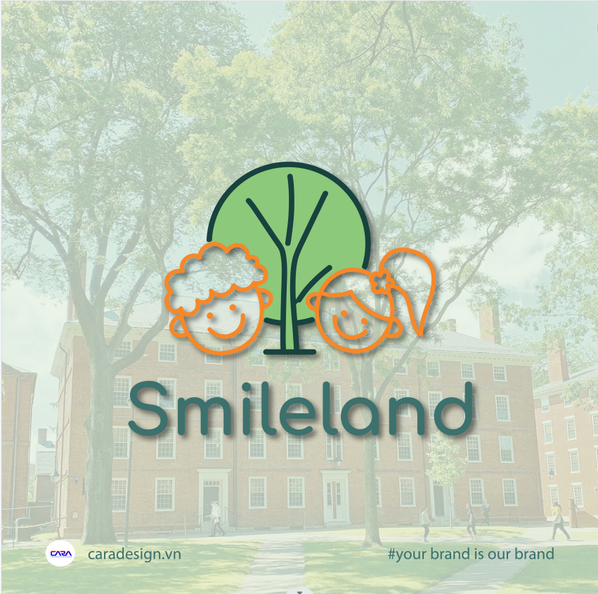 Hình ảnh bé trai tóc xoăn và bé gái tóc buộc lệch cười rạng rỡ bên cây xanh – biểu tượng của sự phát triển tự nhiên và an toàn. Với nét vẽ tối giản cùng phông chữ tròn trịa, bộ nhận diện truyền tải trọn vẹn tinh thần “Smileland”: Một môi trường giáo dục hạnh phúc, thân thiện và gần gũi.